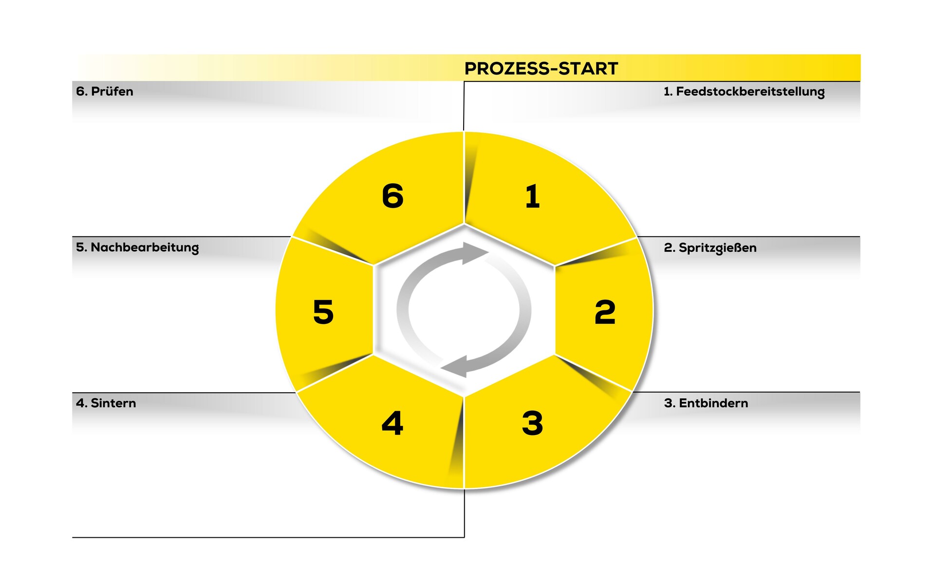 Der Feedstock, ein Gemisch aus feinem Metallpulver und Kunststoffgranulat, stellt das Ausgangsmaterial dar. Dieses lässt sich mittels konventioneller Spritzgussmaschinen zu Formteilen verarbeiten. Der zur Formgebung benötigte Kunststoffanteil wird anschließend über den Entbinderungsprozess wieder herausgelöst.