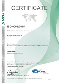 Reich MIM’s manufacturing methods or processes as well as products are certified to ISO standards: